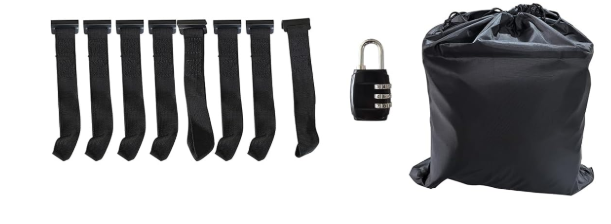 Védőbetétek, ajtókampók, zárak, zsinóros táskák.