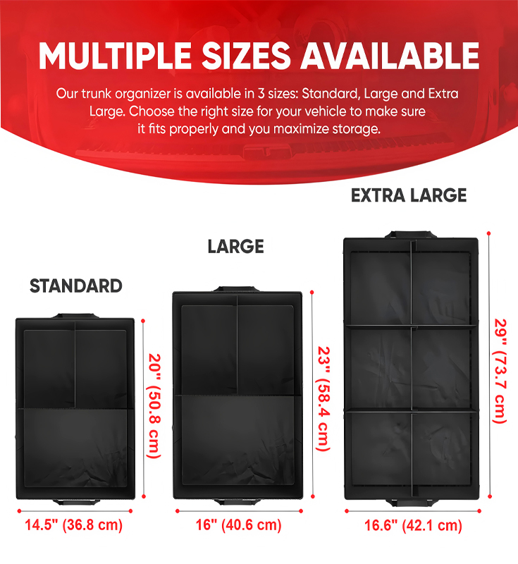 Ez a csomagtartó tárolótáska fedéllel, összecsukható SUV teherautókhoz és szedánokhoz. Mérete 57x33,5x29cm, mely közepes méretű, a belső teret teljes mértékben ki tudja használni a változatos tárolási igények kielégítésére. A tárolótáska súlya 1,8 kg, és Oxford kendőt használ PP vagy MDF lappal. A belső fedél 210D. Az anyag erős és tartós, jó tartási és kopásállósággal rendelkezik. A burkolat kialakítása hatékonyan akadályozza meg a port és védi a tárgyak magánéletét, így a tárgyak autóban való tárolását rendezettebbé és rendezettebbé teszi. Ezenkívül összecsukható, és használaton kívül könnyen tárolható, így helyet takarít meg. A termék 5 db-os dobozba van csomagolva, karton mérete 38X32X35CM, ami kényelmes kötegvásárláshoz és tároláshoz, praktikus dolog az autóban való tároláshoz.